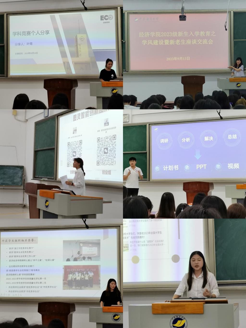 首先,学院学术创新部的前负责人叶青分享了她在大学的学习经验。她详细描述了自己如何制定高效的学习计划以及积极参加各类比赛,提醒同学们要注重拓宽知识面,多读书多思考,积极参加各种学术讲座和研讨会,不断提升自己的学习能力。随后发言的2023级研究生郑倚雯和来自国贸1224的沈振华皆在学习和未来发展规划方面为大家提供了一定建议和思考。