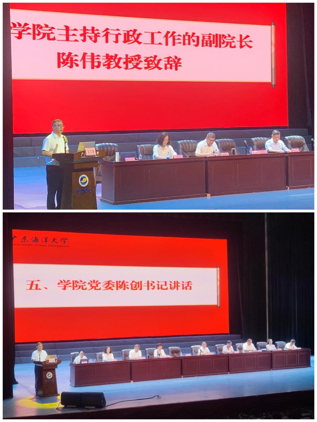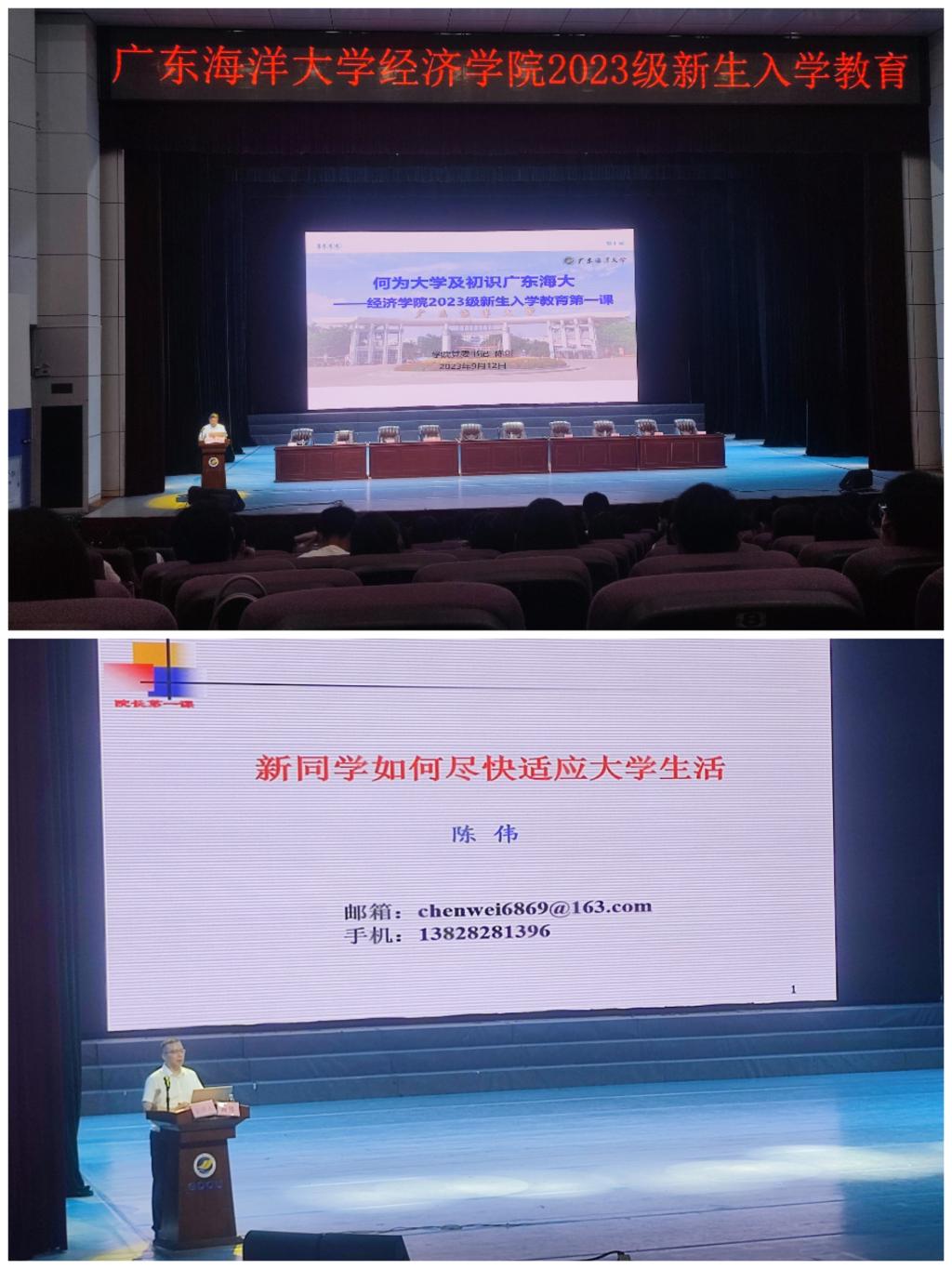 典礼结束后,学院党委书记陈创、副院长陈伟分别为新同学上了入学教育第一课。陈创以《何为大学及初识广东海大》为题,首先对大学的发展历程及学院总体情况进行了简要介绍,随后针对当代大学生应该具备的素质和能力提出了要求和希望。他强调,作为新时代的经院学子,要具备广阔的视野,扎实的理论基础,敢于质疑、勇于创新的精神;要积极参与社会实践和志愿服务,脚踏实地地去了解社会、去体验生活;要保持积极向上的心态,勇往直前;要提升自我,发掘潜力,实现自己的价值。