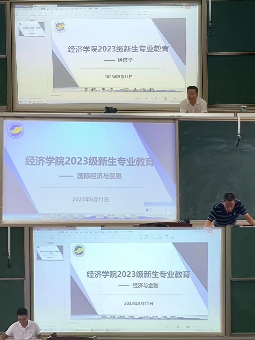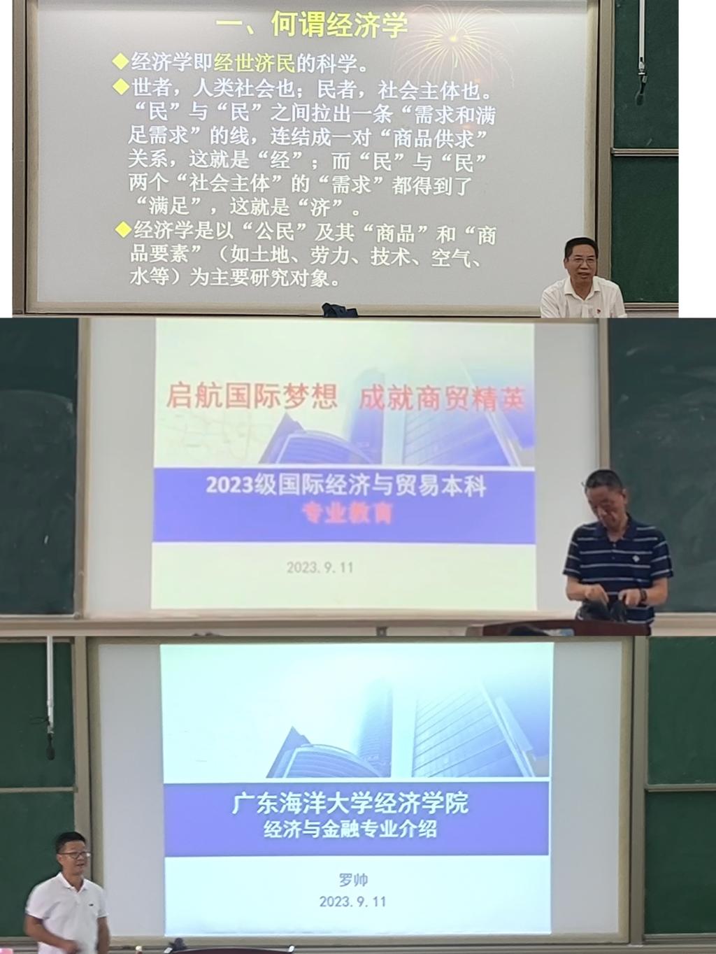 经济学专业教育中,系主任蒋重秀老师首先抛出了一个问题——拿到录取通知书时的感受,引发了同学们热烈讨论,并以此为契机向同学们讲述了“何谓经济学”、“如何学习经济学”两个问题。蒋主任从经济学定义、分类以及学习方法三个方面向新生深入浅出地介绍了经济学专业知识与能力要求。随后,蒋老师从学校发展进程,到学院发展历程、师资队伍再到经济系师资情况,层层细化,向同学们全面介绍了学校、学院及经济学学科体系的基本情况,并分享了其对经济学独到的见解以及强大的认识储备,表达了其对2023级经济学专业新生的期望。
