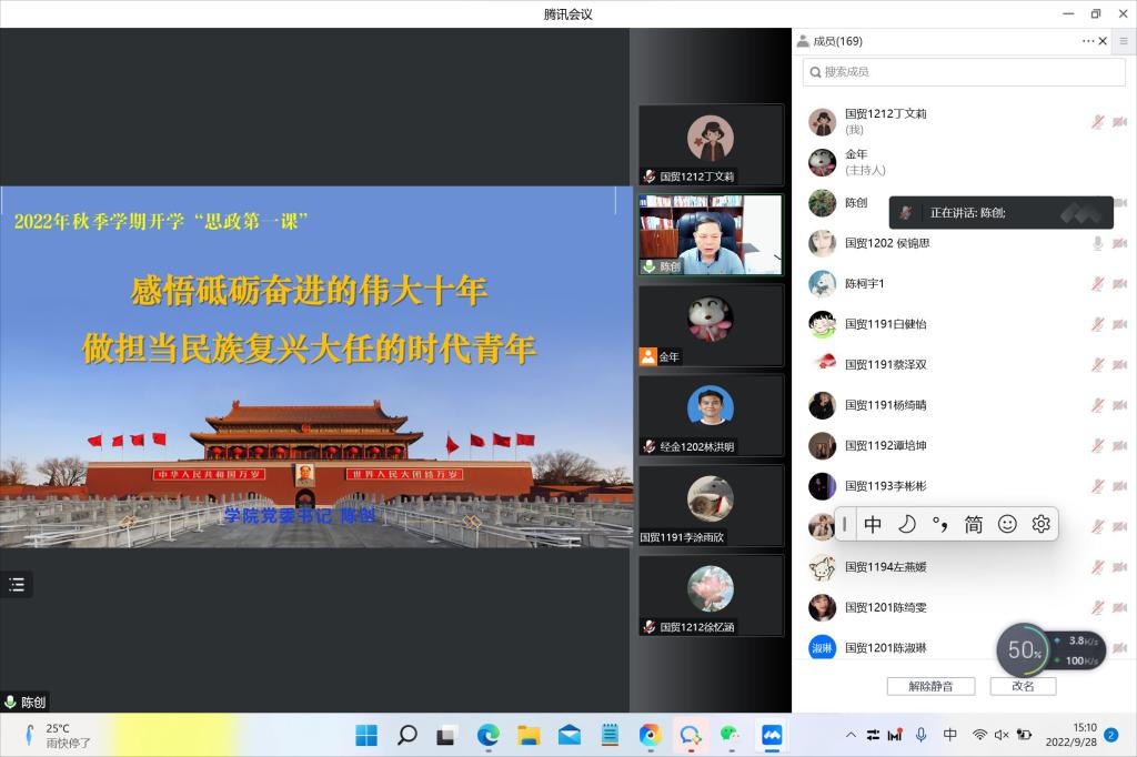 9月28日下午,williamhill英国党委书记陈创利用腾讯会议面向学院入党积极分子、第七期“青马工程”培训班学员共168名学生线上讲授了新学期“思政第一课”。