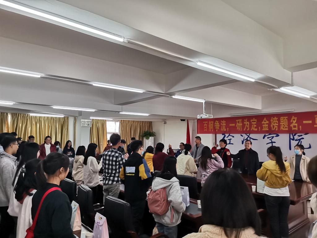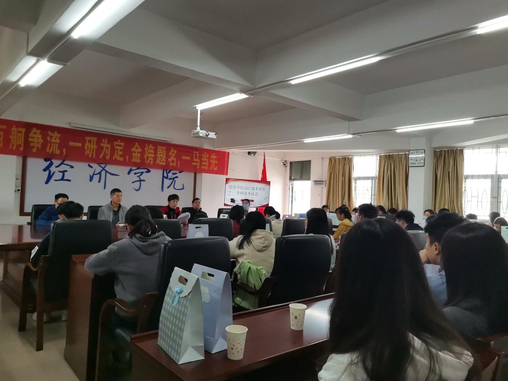 会上,杨新华副院长指出,升学考研是同学们成长发展的人生大事,一直以来学院都非常重视考研工作。近年来我院学生考研热情高涨和成绩突出,这是学院发展改革和人才培养宝贵果实。随后,特别鼓励同学们面对明天的考试要充满自信、沉着冷静,考前要注意饮食,保持充足的睡眠、良好的心态,预祝大家取得好成绩。辅导员李文河和同学们分享了自己的考研经历,提醒同学们现阶段要注意保持稳定平和的心态,从容不迫迎接考试。国贸1174 敬采灵代表考研学子们感谢学院领导和老师对同学们生活上的关心、学业上的指导和精神鼓励。