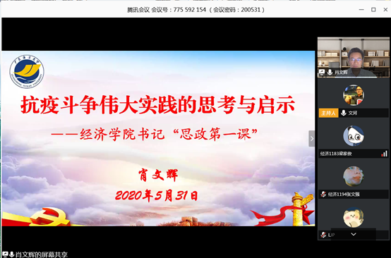 5月31日、6月18日,williamhill英国党委书记肖文辉及代理院长居占杰利用“腾讯视频会议”平台,分别以《抗疫斗争伟大实践的思考与启示》与《做新时代的奋斗者》为题讲授2019-2020学年第二学期“思政第一课”。全体学生党员、学院团委、学生会干部、“青马学员”、研究生和入党积极分子约600人次齐聚“云端”听课。