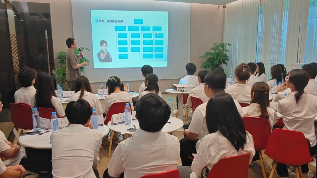 在中信银行工作人员的引导下,大家参观了银行大堂、柜台区、理财区、对公业务区、智能服务区等区域,认真听取了银行历史沿革、经营理念、部门业务等情况介绍。最后,杨劭源老师以《透视金融岗位》为主题,为同学们带来了一场深入浅出的金融知识科普,剖析各金融职位的优劣,并引导大家围绕“金融资产配置策略”展开了一场别开生面的无领导小组讨论。整场活动气氛热烈,取得了超越预期的良好效果。