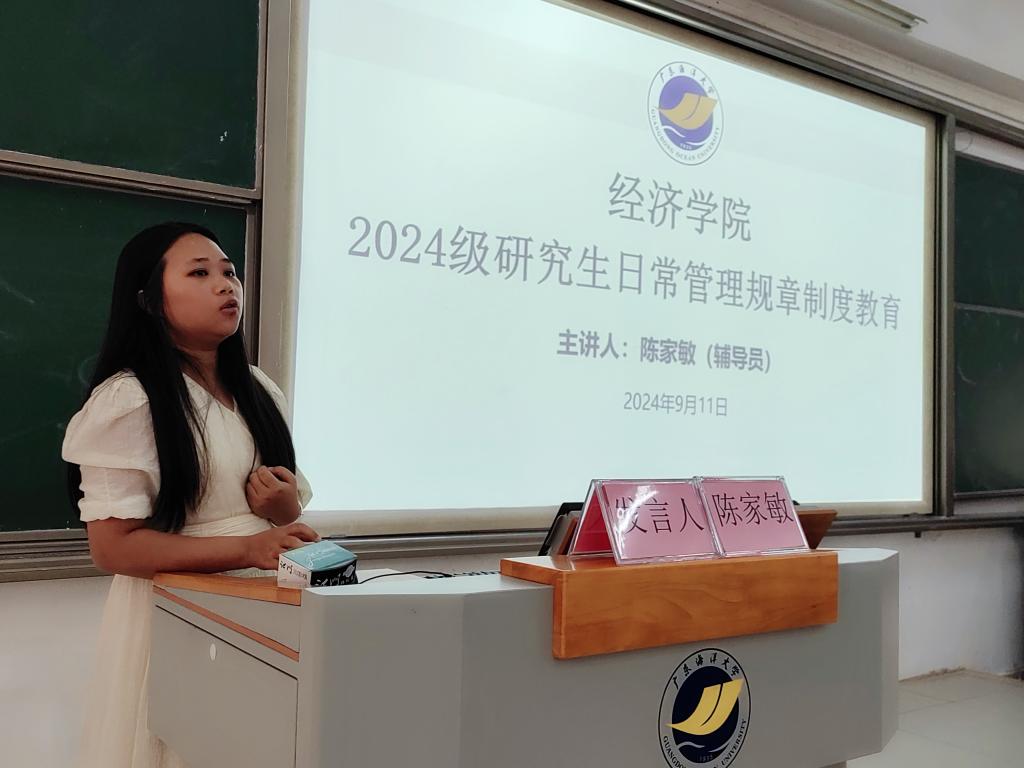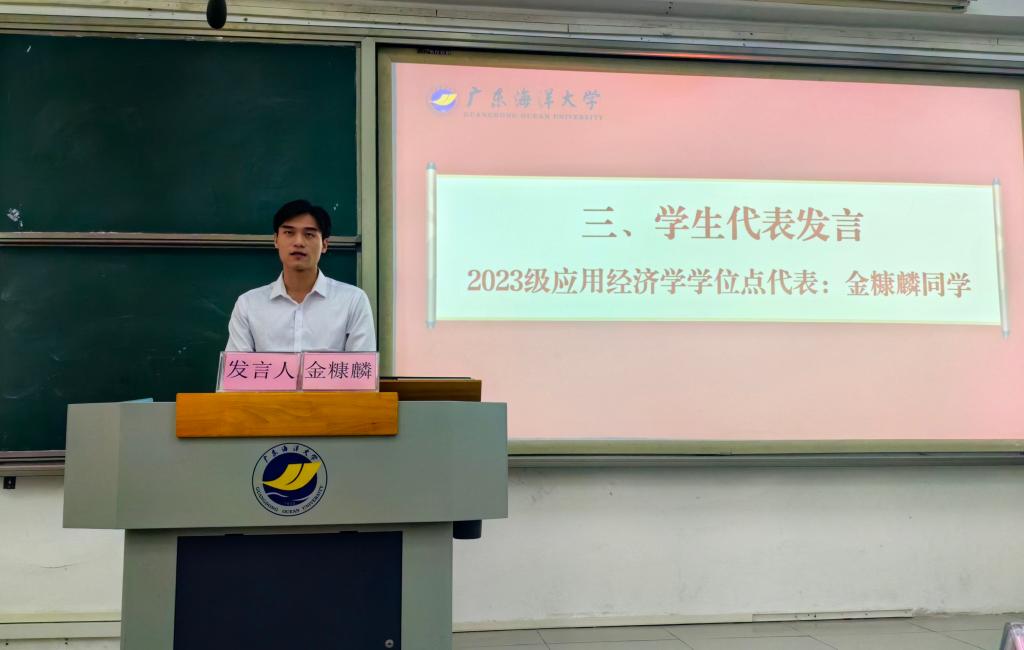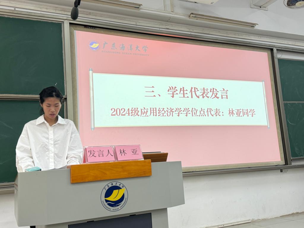 辅导员陈家敏老师讲解了研究生日常管理的规章制度和纪律要求,帮助新生们尽快熟悉学校相关要求,为接下来的学习生活做好准备。应用经济学专业2023级研究生金糠麟同学发言,结合自己的学习和生活经历,鼓励新生要明确目标,躬身实践,勇于探索,勇敢追梦。研究生新生代表林亚表达了对大学生活的憧憬和期待,表示将以全新的身份,怀揣梦想,勇攀高峰。