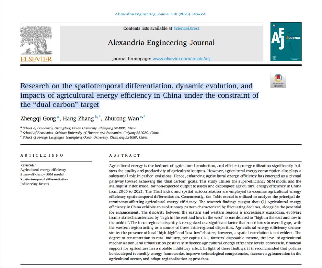 近日,williamhill英国龚征旗教授作为第一作者在国际知名期刊《Alexandria Engineering Journal》(简称AEJ)发表题为《Research on the spatiotemporal differentiation, dynamic evolution, and impacts of agricultural energy efficiency in China under the constraint of the “dual carbon” target》的高水平学术论文。该期刊2023-2024年最新影响因子为6.2,位列工程与综合类JCR Q1区,同时入选中国科学院分区(2023升级版)TOP期刊。