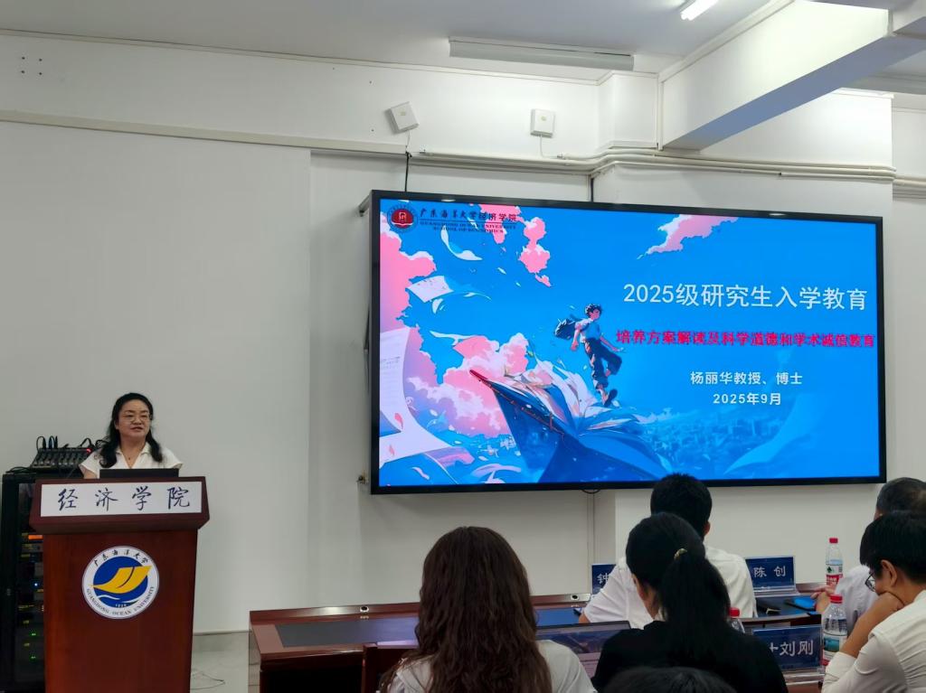 副院长杨丽华作科学道德和学术诚信教育、培养方案解读专题教育,从学院学科发展现状,到研究生人才培养计划及环节进行全面介绍,让同学们对学院以及专业有了更系统、深入认识。她引用“天行健,君子以自强不息;地势坤,君子以厚德载物”这一古训勉励新生,希望同学们既要有开拓进取、求实创新的精神,也要涵养厚德载物、兼容并蓄的品格,在学术和人生的道路上笃行不怠、砥砺前行。