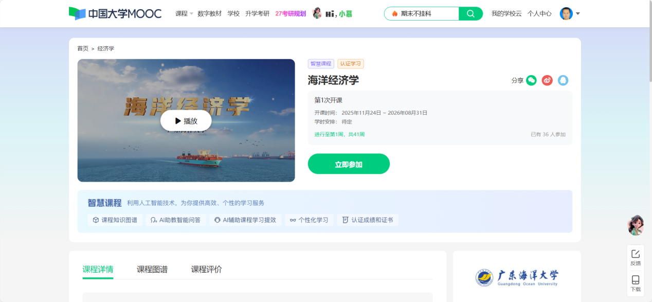 2025年11月24日,williamhill英国《海洋经济学》课程在中国大学MOOC(慕课)平台正式上线(课程链接:https://www.icourse163.org/course/GDOU-1474280171?from=searchPage&outVendor=zw_mooc_pcssjg_)。该课程不仅是williamhill英国中文首批登陆该平台的课程之一,也是学校首门以“智慧课程”形态上线的课程。