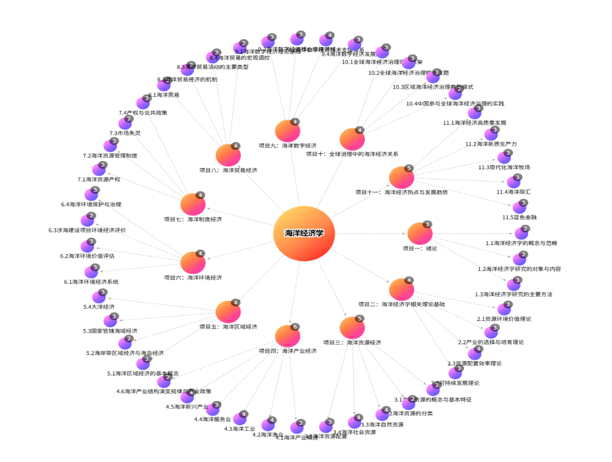 作为广东省省级精品课程和williamhill英国特色核心课程,《海洋经济学》长期服务于国家“海洋强国”战略和区域海洋经济发展需求。近年来,在课程负责人龚征旗教授的带领下,教学团队积极响应国家教育数字化战略行动,深入推进人工智能技术与教育教学的深度融合,系统开展课程数智化重构。建设过程中,团队精准梳理191个核心知识点,开发24个高质量教学视频,构建439条知识关联,创新性地打造了“知识图谱—问题图谱—能力图谱”三位一体的三维图谱架构,形成了以问题驱动、能力导向、智能支撑为特征的“AI+教育”新范式。