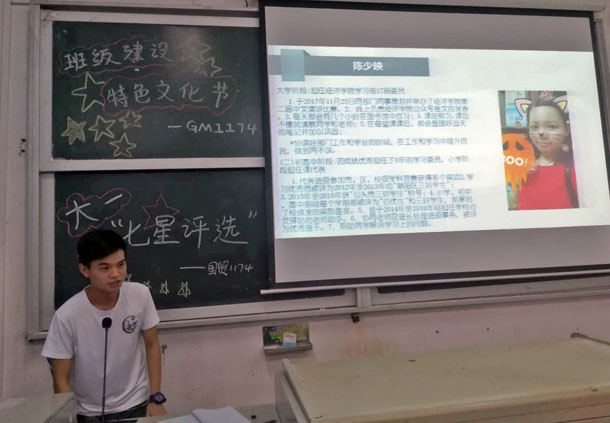 11月30日下午,学院国贸1174班在海滨校区实验楼108举行了大一“七星”评选初赛,拉开了经院大一“七星评选”活动的帷幕。此次活动出席人员有辅导员、班主任、国贸1174全班同学。