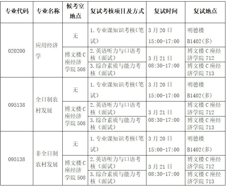 各专业复试时间、地点安排:
