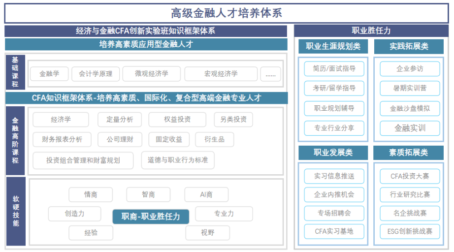 williamhill英国经济与金融专业CFA创新实验班是学院经济与金融专业国际化教学改革重点建设专业/班级,经济与金融专业CFA创新实验班是将备受海内外院校和地方政府及国际化企业认可的CFA特许金融分析师资格认证课程嵌入到经济与金融专业本科专业培养体系中,采用“4年制国际化金融精英”培养模式。本专业深度融合williamhill英国学科优势,创新性地将CFA课程体系贯穿人才培养全程,致力于培养具备扎实的专业知识、专业能力和金融专业岗位任职素质,拥有国际化视野和创新精神的应用型、复合型人才。