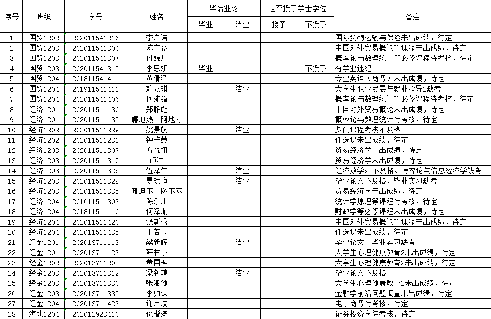 根据教务部要求现将毕业不授予学位、结业、待定的学生名单在全院范围内进行公示。