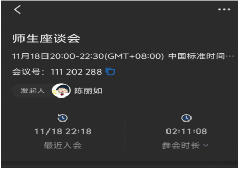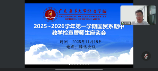 国贸系于2025年11月18日20:00至22:30通过腾讯会议(会议号:111-202-288)组织召开了2025-2026学年第一学期期中师生座谈会。会议由院领导、系正副主任、全系教师及各班级学生代表(包括班长、团支书和学习委员)共同参与。此次会议是为了加强师生沟通,凝聚共识,围绕学风建设与教学改进等议题展开深入交流。