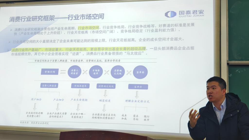 讲座现场,郑经理凭借国泰君安研究所的一手最新数据,巧妙切入,解析了消费行业生意特性与商业模式,强调了商业模式在现代企业竞争的核心地位;接着,他层层递进,深入探讨消费行业研究框架,从多个维度抽丝剥茧,为同学们剖析那些能够助力投资决策的精妙思维;不仅如此,他还聚焦供需两端关键要点,以敏锐视角帮助同学们精准洞察消费行业的动态趋势与变化风向;最后,他利用经典三力模型(品牌力、产品力、渠道力),直观展示企业核心竞争力的内在架构,为同学们构建起系统的商业认知体系。