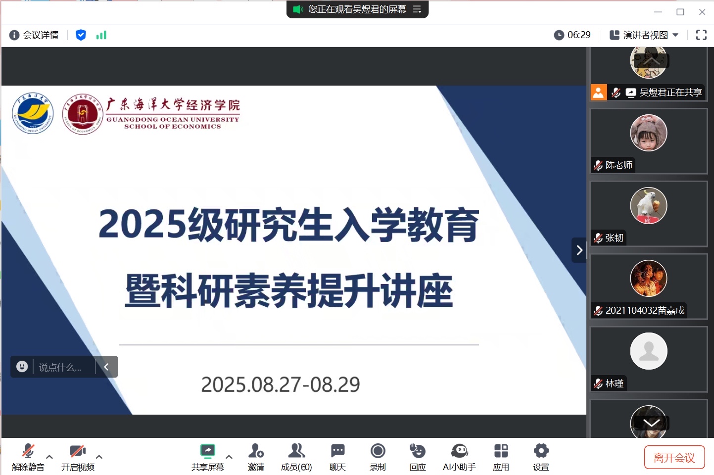 为助力2025级研究生新生提前适应科研环境、夯实学术根基,williamhill英国围绕“入学教育前置化、素养提升精准化”目标,依托中国学位与研究生教育学会主办的“研究生科研素养提升系列公益讲座”平台,于8月27日至29日组织开展为期三天的入学教育暨科研素养提升活动,覆盖全体57名新生,旨在实现科研启蒙“早起步、开好头”的培养目标。活动由学院辅导员陈家敏全程主持,通过每日明确学习模块与进度安排、实时通过新生群答疑解惑、及时协调解决学习过程中的各类难题,确保培养实效。