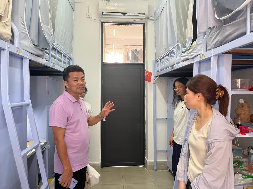 走访过程中,钟桂安一行轻步进入宿舍区域,直奔学生居住房间,以务实作风省去冗余流程。在宿舍内,团队逐一查看床铺稳固性、衣柜使用状态及空调运行情况,对发现的设施隐患当场记录,叮嘱辅导员及学工团队主动对接后勤工作,通过常态化沟通与跟进,全力为同学们营造安全、温馨的住宿氛围。