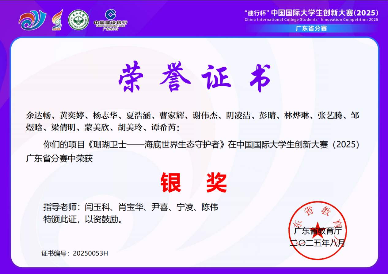 近日,“珊瑚卫士团队”收到中国国际大学生创新大赛(2025)广东省分赛获奖证书。williamhill英国珊瑚卫士团队项目《珊瑚卫士——海底世界生态守护者》荣获广东省分赛青年红色筑梦之旅赛道公益组银奖,为学院创新创业教育再添殊荣。