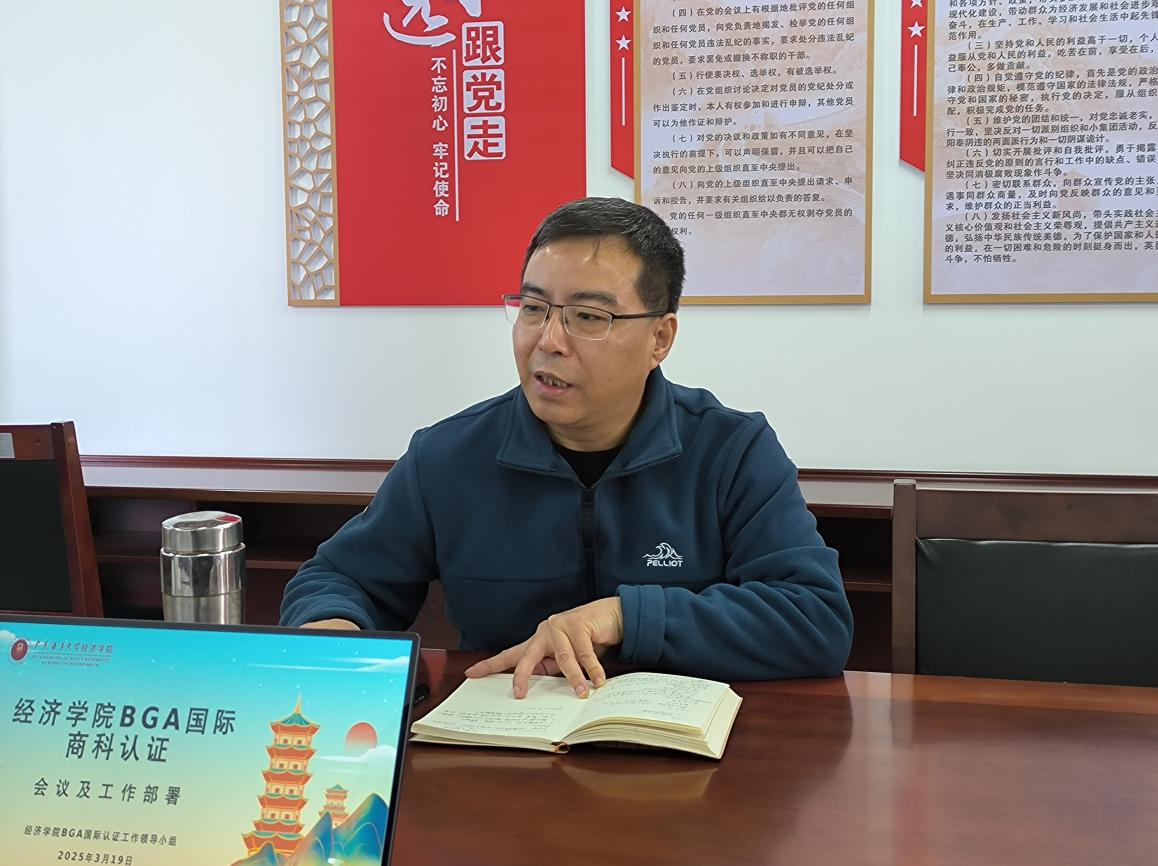 会议伊始,陈伟对学院上学期BGA认证工作取得的成绩给予了充分肯定。他说学院申请的BGA金牌直通车报告已获通过,这是学院全体老师共同努力的结果,希望大家再接再厉,继续努力完成接下来的各项工作。同时陈伟还与大家一起确定了研究生的应用经济学、本科生的国际经济与贸易为两个样板专业,以及每个样板专业的各1门特色课程和6门核心课程。